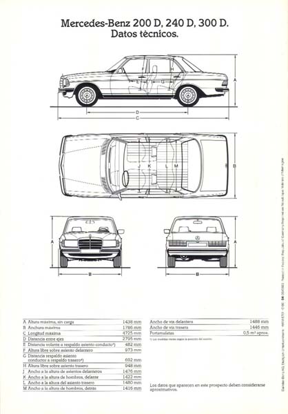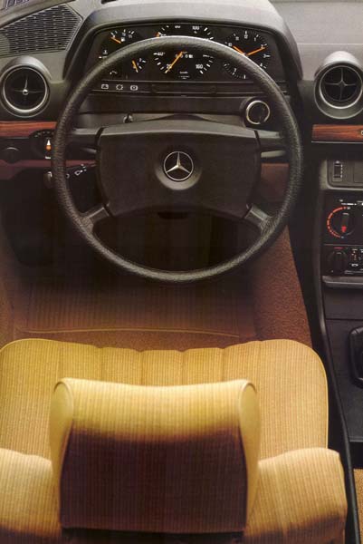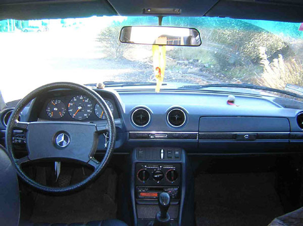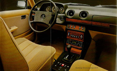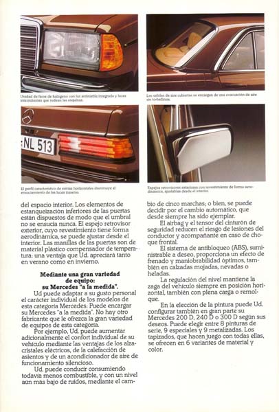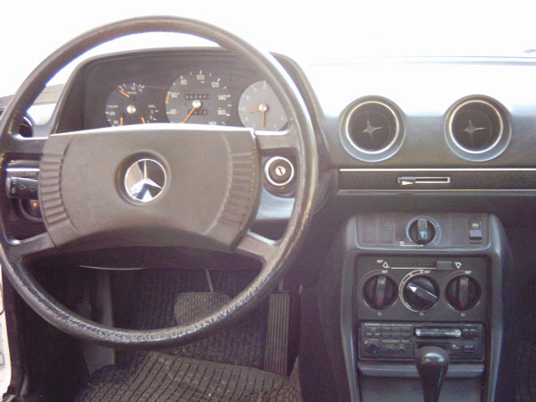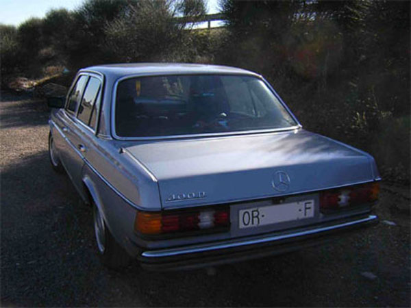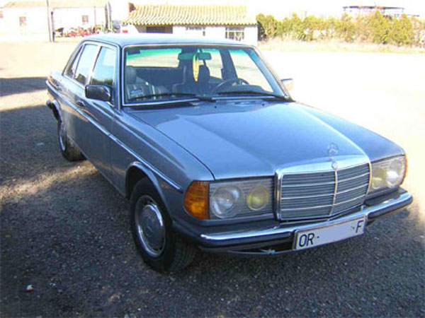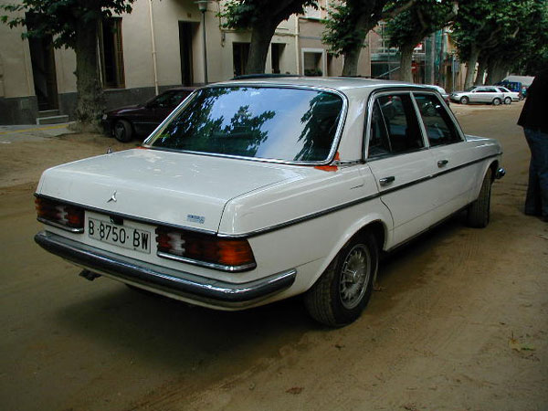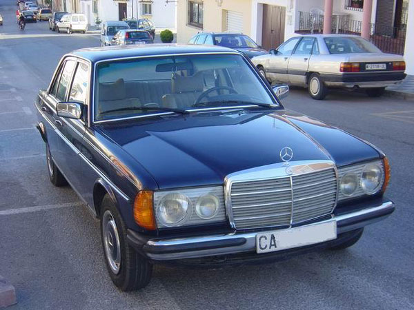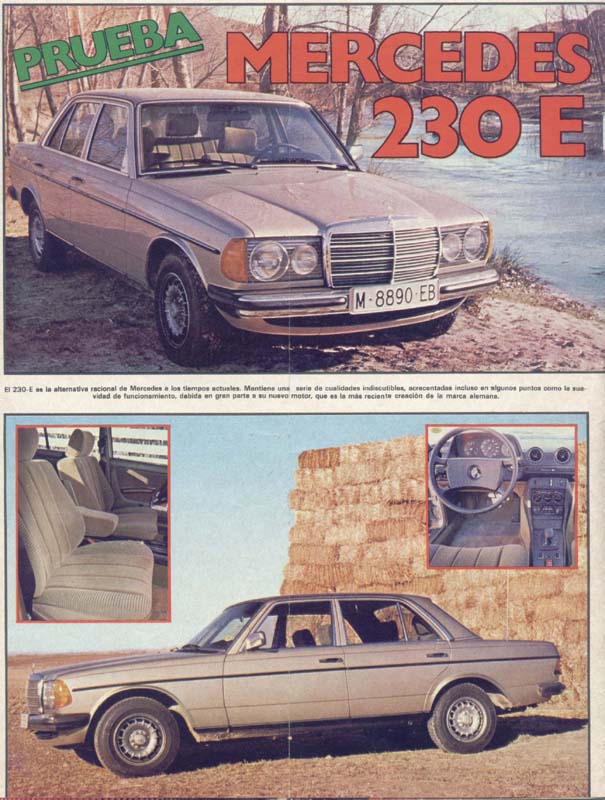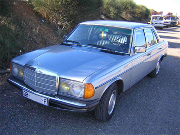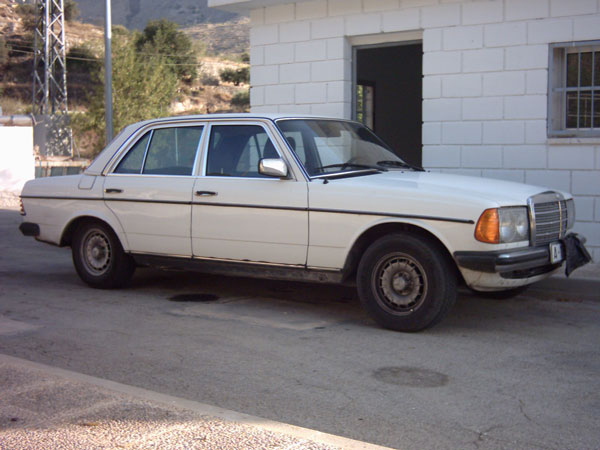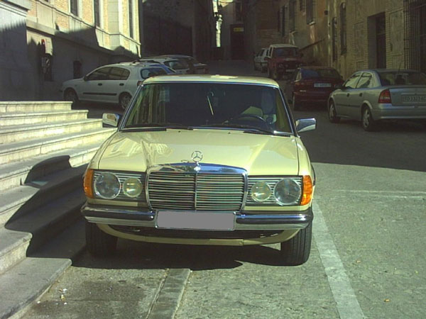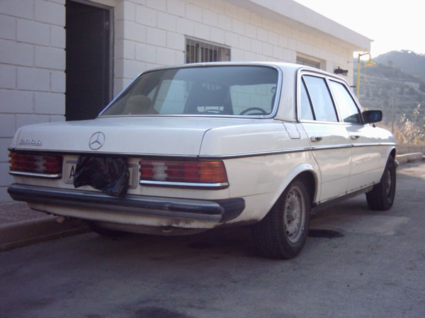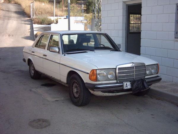 Mi Mercedes es un 230 E automático de 1982 que yo adquirí de segunda mano en un concesionario de la marca en Madrid en el año 1991 (estaba en estado óptimo como lo confirmaba la garantia por escrito que la casa me dio en su dia). Es de color Beige Arena con tapiceria original mixta tela/skay verde; tiene como opciones aparte del cambio automático, cierre centralizado, elevalunas delanteros eléctricos, regulación electrica de altura de faros, lunas tintadas, dirección asistida, aire acondicionado, apoyabrazos en asientos delanteros, equipo de radio-cassette con antena automática y alguna opción menor que pueda olvidar.
