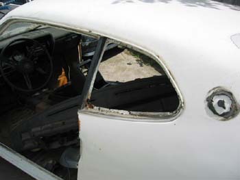 Aquí ya sin la luna delantera y con el tapizado del techo suelto. Al final con mucho cuidado se soltaron los scais de los pasos de rueda traseros para hacer las cosas un poco mejor. En las esquinas de la luna (se ve en negro) se lijó, echó oxino y se soldó un poco de chapa galvanizada nueva.
