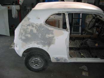 Antes de pintar se imprimó el coche, y aunque tal vez no sea la mejor manera (hubiese sido mejor quitar la pintura) es otra manera de proceder si no dispones de presupuesto suficiente. Aunque se no le habían quitado la luneta delantera después si lo hicieron y fue un detalle que la verdad no me hizo mucha gracia, pues podrían haber quitado la luneta delantera y directamente imprimar todo (menos mal que me iba a costar igual). De todos modos creo recordar que lo imprimaron directamente pues había partes en chapa viva y es ahí cuando la corrosión ataca con más virulencia. Recuerdo que cuando fui una vez a chorrear unas piezas del mini me dijo el operario que imprimase sin falta pues las piezas se oxidarían rápido (y para colmo el día de recogida llovía); así que para todo aquel que esté pensando en hacer una restauración en condiciones, recomendarle que se lleve una lona el día de recogida del coche del “chorreador” y que vaya directamente a la cabina de pintura a imprimar.