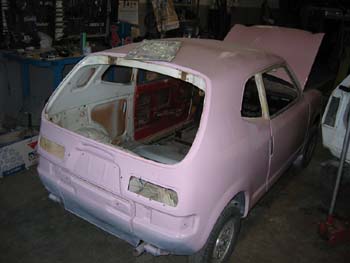 Y llegó el día en que lo ví pintado por primera vez. El código de pintura es el “POP Orange” (YR-12) de Honda, que es con el que salió el coche de fabrica, y que tardaron un mes en mandarlo desde Barcelona porque no lo encontraban. Lo curioso es que en las microfichas que tenía el chapista, estaban los códigos de pintura del Honda N 600 (el forero Óscar tiene uno, por si queréis ver de qué modelo se trata), que es el modelo anterior y que no se comercializó en España. El “televisor” (ventanal trasero) era una de las piezas nuevas originales que llevaba el coche, el anterior dueño lo debió comprar hace relativamente poco, pues las gomas estaban impecables y el color grisáceo es el de la imprimación que trae de fábrica, siendo su color el negro (y así se pintó). Esta es una pieza realmente “jodida”, ya que es de las pocas que Honda ya no hace y no hay en stock (de hecho el otro honda que tengo lleva un plástico remachado en lugar de cristal), así que hice bastante hincapié al chapista en que esa pieza debía seguir intacta.