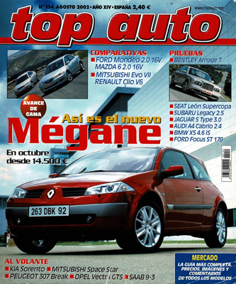 Prueba del Bentley Arnage. Al volante del Saab 9-3. Nuevo Renault Mégane. Al volante del Kia Sportage. Prueba del Ford Focus ST 170. Prueba Comparativa: Mazda 6 2.0 16v Active/Ford Mondeo 2.0 16v Ghia. Prueba Comparativa: Seat León 20 VT 4/Seat León Supercopa. Prueba Comparativa: Mitsubishi Lancer EVO VII/Renault Clio V6. Prueba del Subaru Legacy 2.5. Prueba del Jaguar S-Type 3.0 Sport. Prueba del Audi A4 2.4 Cabrio. Pruebas deportivas nacionales e internacionales. Prueba de la Suzuki SV 650.