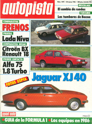Comparativa entre el Renault 18 GTX Familiar y el Citroen BX 19 TRS Break, futuro Jaguar XJ40, contacto del Alfa Romeo 75 1.8 Turbo, pruebas de resistencia de frenos, publicidad-catalogo de Ford Gama 86, prueba del Lada Niva, Lancia en competicion, y muchos reportajes mas.