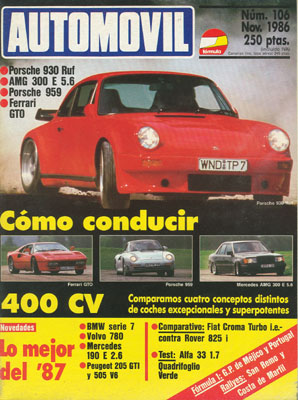 Prueba Comparativa: Porsche 930 Ruf/Mercedes AMG 300 E 5,6/Ferrari GTO/Porsche 959. Prueba Comparativa: Fiat Croma Turbo i.e./Rover Sterling. Contacto con el Alfa Romeo 33 Quadrifoglio Verde 1,7. Entrevista con Jean Todt. Rallye San Remo y Costa de Marfil. Fórmula 1: Portugal y México. Euroturismos: 500 km del Jarama. Técnica: Aerodinámica.