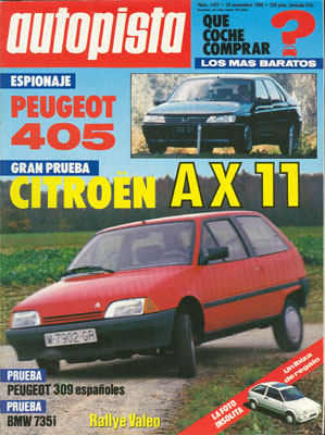 Prueba Comparativa: Peugeot 309 GL Profil/309 SR/309 GT. Prueba del BMW 735i. Qué coche comprar? Los más baratos. Banco de Pruebas del Citroën AX 11 TRE. Rallye Valeo. Fórmula 1 1986.