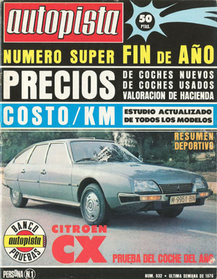 NUMERO ESPECIAL FIN DE AÑO. Arturo Andrés prueba del Citroën CX 2400 Palas. Catálogo de todos los modelos presentados en 1976. Los grandes temas del año. La industria española de la automoción en 1976. La edad de las matrículas desde 1950. VI Campeonato de España de F-1430. Campeonato del Mundo de F1. Publicidad en color de todos los modelos Seat de 1976.