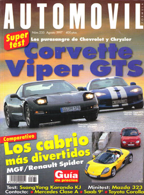 Prueba Comparativa: Chevrolet Corvette/Chrysler Viper GTS. Dossier: los americanos en España. Prueba Comparativa: Renault Spider/MGF 1.8 VVC. Prueba del Ssang Yong Korando KJ 2.9 D. Prueba del Mazda 323 1.5i Hatchback. Gran Premio de Francia de F1. Gran Premio de España de F1. Baja España-Aragón ´97. Rallye de Orense y de Avilés. Mercedes-Benz 300 SL "Alas de gaviota" de 1956.