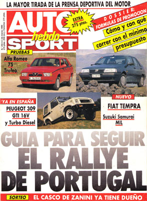 Prueba del Peugeot 309 GTi 16v. Prueba del Peugeot 309 SRD Turbo. Prueba del Fiat Tempra. Prueba del Suzuki Samurai Mil. Prueba del Alfa Romeo 75 1.6 Trofeo. Dossier: fórmula de promoción. Rallye de Portugal.