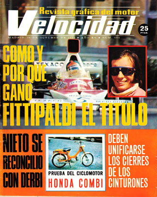 Innovaciones en los Citroën españoles para 1975. Presentación a la prensa de la nueva gama Simca 1200. La motocicleta a través del tiempo: Bultaco. Octava edición de la F.A.M.O. (Feria Mercado del Automóvil y Maquinaria de Ocasión). Prueba de la Honda PS-50 Combi. Emerson Fittipaldi: el porqué de un segundo título mundial. Copa Barcelona: Rabat impuso su Alpine-Tibidabo. Reconciliación Nieto-Derbi. Consultorio del lector.