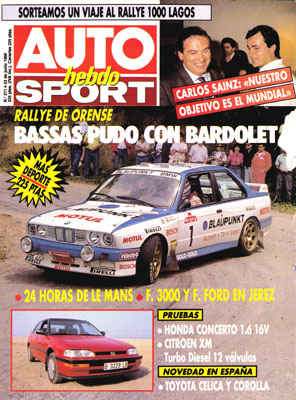Homenaje a Carlos Sainz. Prueba del Honda Concerto 1.6. Nuevos Tollota Celica y Corolla. Prueba del Citroën XM Turbodiesel. Gran Premio de Jerez de F-3000. XXIII Rallye de Orense. 24 Horas de Le Mans. Pruebas regionales. Ecos del Rallye Acrópolis.