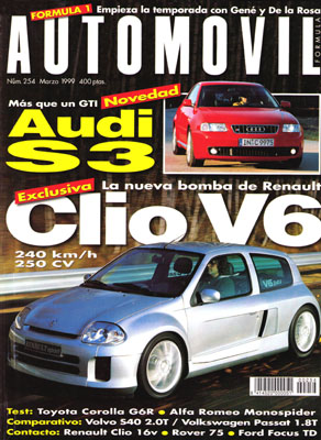 Presentación en exclusiva del Renault Clio V6. Renault Avantime. Prueba del Alfa Romeo Monospider. Prueba del Toyota Corolla G6R. Prueba Comparativa: Volvo S40 2.0 T/Volkswagen Passat 1.8T. Fórmula 1: los equipos de 1999. Jean Todt. Calendario internacional. Rallye de Montecarlo y Suecia. Renault 4 CV.