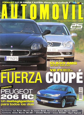 Prueba Comparativa: Maserati Coupé /Mercedes CLK55 AMG. Contactos: Opel Signum, Lexus RX300, Citroën Pluriel, Peugeot 206 RC, Aston Martin DB AR1. Los Aston Martin de 007. Aston Martin AM V8. Fórmula 1: G.P. de España y Austria. Rallye de Argentina. Rallye de Cantabria. Campeonato de España de GT: Albacete y Jarama. Clásicos: Maserati Indy.