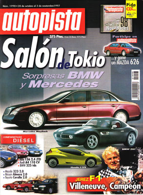 Salón de Tokio. Salón de Sevilla. Trafic 97. Accidentalidad en Madrid y Barcelona. Gama Opel 1998. Prueba Comparativa: Alfa Romeo 156 JTD/Audi A4 1.9 TDi/BMW 325 tds. Prueba Comparativa: Mazda 323 2.0 D/Nissan Almera 2.0 D/Toyota Corolla 2.0 D. Prueba del BMW 323 ti. Contactos: Volvo V70 XC, Citroën XM V6, Citroën Berlingo Multispace, Gama europea de General Motors, Mercedes E55 AMG. Los vehículos eléctricos en España. Gran Premio de Europa de F1.