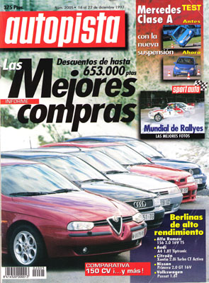 Prueba Comparativa: Alfa Romeo 156 2.0 TS/Audi A4 1.8T Tiptronic/Citroën Xantia 2.0 Turbo CT Activa/Nissan Primera 2.0 GT/Volkswagen Passat 1.8T. Nuevo Mercedes Clase A. Prueba del Jeep Grand Cherokee 5.9 V8. Microauto VSP. Ideas para regalar en Navidad. Resumen de la temporada del Mundial de Rallyes. La nueva reglamentación de la F1. Prueba del Mitsubishi Lancer Evo III, Gr.N. Superfórmula Toyota 1998. Gama Suzuki 1998.