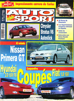 Al volante del Chrysler Stratus V6 Autostick. Prueba Comparativa: Hyundai Coupé 2.0 16v FX/Fiat Coupé 1.8 20v. Salón Internacional de Amsterdam. Al volante del Nissan Primera GT. Rallye de Suecia. Entrevista a Heinz Harald Frentzen. Equipos del BTCC en España. Circuitos: Panorama temporada '97. XVIII 24 Horas de Chamonix.