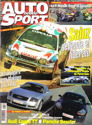 Prueba Comparativa: Audi TT/Porsche Boxster. Salón Auto-Retro, aparece el Pegaso Thrill. Prueba Comparativa: BMW Compact 316i/Mercedes A160 Avantgarde. Prueba del Suzuki Jimny JLX 4WD. Presentación del Volkswagen New Beetle. Carreras en el Circuito del Jarama. Rallye de Australia. Entrevista con Javier Díaz. Prueba Racing del Lamborghini Diablo SV-R.