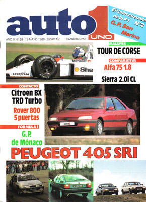 Prueba Comparativa: Alfa Romeo 75 1.8/Ford Sierra 2.0i. Prueba del Peugeot 405 SRi. Contacto con el Citroën BX TRD Turbo. Expomóvil ´88. Contacto con el Rover 800 5 puertas. Subida a Montseny. Gran Premio de San Marino de F1. Gran Premio de Montecarlo de F1. Campeonato de Europa de Turismos en el Jarama. Tour de Corse.