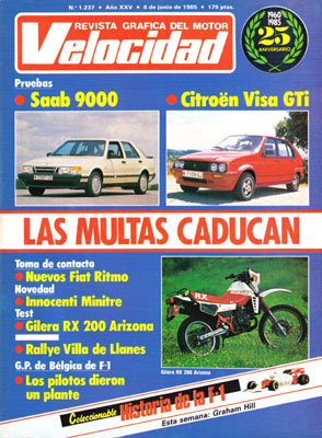 Prueba del Saab 9000 Turbo. Nuevos Fiat Ritmo. La industria soviética del automóvil. Prueba del Citroën Visa GTi. Historia de la Fórmula 1, los pilotos: Graham Hill. Test de la Gilera RX 200 Arizona. Rinspeed Porsche 969 Turbo. Consultorio técnico del lector. Rallye Villa de Llanes. Campeonato alemán de F3. Rallye Acrópolis.