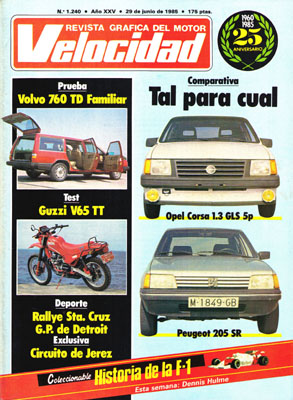 Prueba Comparativa: Opel Corsa 1.3 GLS/Peugeot 205 SR. Mercedes bb Magic Top. Prueba del Volvo 760 GLE TD Familiar. Historia de la Fórmula 1, los pilotos: Dennis Hulme. Consultorio técnico del lector. Test de la Guzzi V 65 TT. Circuito de Jerez, sueño real. Gran Premio de Detroit de F1.