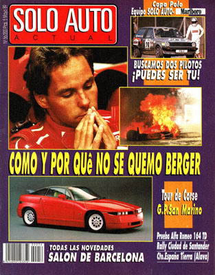 Rallye Ciudad de Santander. Tour de Corse. Prueba del Alfa Romeo 164 TD. Rallye Cales de Palafrugell. Gerhard Berger entre las llamas, por Javier del Arco. IX Gran Premio de San Marino de F1. Avance del Salón del Automóvil de Barcelona. Prueba del Lada Samara 1300. Rallye RACE Alava.