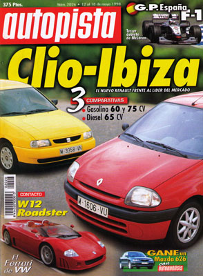 Contacto con el Volkswagen W12 Roadster. Comparativas: los nuevos Renautl Clio contra el Seat Ibiza. Prueba del Volvo S40 1.8i. Consultorio del lector. Lo que cuesta sacarse el carnet. Contacto con el Nissan Micra Diesel. Tour de Corse. Gran Premio de España de F1.