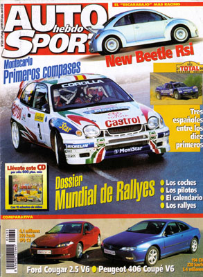 Prueba Comparativa: Ford Cougar 2.5 V6/Peugeot 406 Coupé V6. Volkswagen New Beegle Rsi. Nuevo Ford Thunderbird. La fuerza de Daewoo. Rallye de Montecarlo. Granada Dakar. Dossier: Mundial de Rallyes '99. Fórmula 1: ensayos en Montmeló. Todas las pruebas regionales. Prueba Racing del Citroën ZX 16v Turismo Series. Reportaje sobre el Hyundai Coupé AhS.