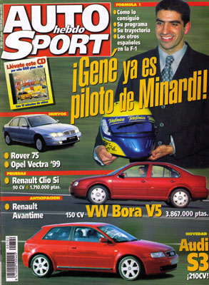 Anticipación: Renault Avantime. Prueba del Volkswagen Bora V5. Gama Opel Vectra '99. Nuevo Audi S3. Prueba del Renault Clio 1.6 Si. Prueba Comparativa: Hyundai Sonata GLS V6/Ford Mondeo RSi. Marc Gené ficha por Minardi. Españoles en la F1: historia de un desamor. Entrevista con Oscar Fuertes y Michael Huete. Premios Desafío Peugeot '98. Avance Rallye España-Cataluña. Avance Rallye de Suecia.