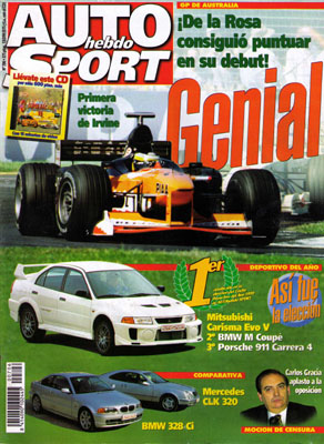 Mitsubishi Carisma Evo V: elegido deportivo del año. Prueba Comparativa: BMW 328 Ci/Mercedes CLK 320. Al volante del Mitsubishi Montero '99. Moción de censura en la FEA: victoria de Gracia. Gran Premio de Australia de F1. GT's en el Jarama. Entrevista con Oriol Serviá. Prueba Racing: Speed Car 2 Honda 600.