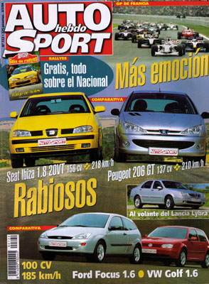 Prueba Comparativa: Peugeot 206 GT/Seat Ibiza 1.8 20VT Sport. Al volante del Renault Laguna 140 CV y dCi. Prueba Comparativa: Ford Focus 1.6 16v/Volkswagen Golf 1.6 Highline. Al volante del Lancia Lybra. Prueba del Fiat Marea JTD 130 HLX. Gran Premio de Francia de F1. Guía de Rallyes: Avilés. Fórmula Rallye de Oviedo. Promoción: Club Viper, 24 horas para no olvidar. Euro Open by Nissan, de Valencia al Jarama. Nacional de Montaña: Totana. Trofeo RACE de turismos en el Jarama. Clásicos: II Rallye Vasco-Navarro.