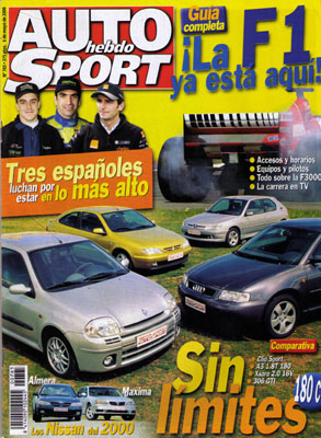 Prueba Comparativa: Renault Clio Sport/Audi A3 1.8T 180/Peugeot 306 GTi/Citroën Xsara 2.0 16V VTS. Prueba del Nissan Almera 1.8 Sport. Al volante del Nissan Maxima QX. Prueba Comparativa: BMW 323 Ci Cabrio/Volvo C70 2.0T Cabrio. Salón de Vigo. Nacional de GT's: Estoril. Guía del G. P. de España de F1. Entrevista a Fernando Alonso. Todas las pruebas regionales.