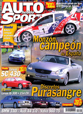 Al volante del Lexus IS300. Prueba del Lexus SC 430. Prueba Comparativa: Audi A4 3.0 Multitronic/Volvo S60 T5 Optima/BMW 330i Steptronic. Prueba del Mazda 323 2.0 16v Sportive. Nuevo BMW M3 CSL Concept Car. Rallye de Nueva Zelanda. Rallye Príncipe de Asturias. Luis Monzón, campeón de España de Rallies de Asfalto. Rallye Desierto de las Palmas. 24 Horas de Barcelona. G.P. de USA de F1.