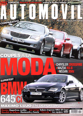 Prueba del BMW 645Ci. Prueba Comparativa: Chrysler Crossfire/Mazda RX-8/Nissan 350Z. Dossier: deportivos medios. Contacto con el Maserati Quattroporte. Calendario deportivo nacional e internacional. Prueba Racing del Subaru Impreza WRX STI Copa. Rallyes de Montecarlo y Suecia.