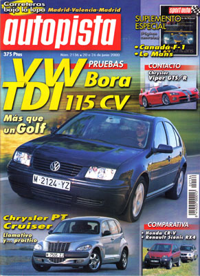 Prueba del Chrysler PT Cruiser Limited 2.0. Prueba del VW Bora Highline 1.9 TDI 115. 24 Horas de Le Mans. G.P. de Canadá de F1. Rallye Ciudad de Cartagena. Opel Nissan en Albacete. Seguros en la red. SEAT, 50 años de vida. Contacto: Citroën Xsara Dynactive, Chrysler Viper GTS/R. Prueba Comparativa: Honda CR-V/Renault Scenic RX4.