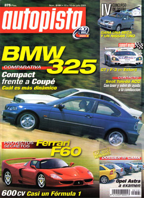 Prueba Comparativa: BMW 325 ti Compact/BMW 325 Ci Coupé. IV Concurso de Diseño de AUTOPISTA. Proyectos secretos de Ferrari. Contacto: Toyota Avensis Verso, Toyota RAV4 D4-D, Seat Toledo ACC. Dossier de gama: Opel Astra. Prueba del Renault Twingo 1.2 16v Privilege. Avance del G.P. de Gran Bretaña de F1. Rallye de Avilés. Rallye de Alemania. Campeonato de España de G.T.: Estoril.