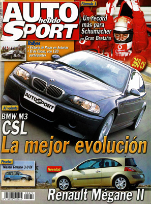 Al volante del BMW M3 CSL Prototipo. Nuevo Renault Megane II. Prueba del Mercedes CLK 320. Prueba del Nissan Terrano 3.0 DI. G.P. de Gran Bretaña de F1. Telefónica World Series en Monza. Rallye de Avilés. Avance Rally Safari.