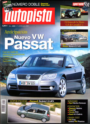 Anticipación: VW Passat 2005. Prueba Comparativa: Alfa Romeo 147 1.9 JTD/Nissan Almera 2.2 16v dCi. Contactos: Daewoo Nubira, Saab 9-3 Cabrio, Honda FCX, Ford GT. Super Prueba Renault Scenic 1.9 dCi. Nuevo Opel Vectra Caravan. Clásicos: Ford GT 40. Prueba de choque: VW Phaeton contra VW Polo. 24 Horas de Le Mans. G.P. de Canadá de F1. Suplemento: mejora tu conducción con Carlos Sáinz.