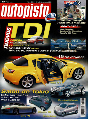 Prueba del Fiat Stilo JTD Dynamic. Contactos: Porsche 911 Targa, Lamborghini Murciélago, Jeep Cherokee. Salón de Tokio. Prueba Comparativa: Audi A4 2.5 V6 TDi/BMW 320d/Mercedes C220 CDi Aut./Volvo S60 D5 Optima. Rallye de Tierra de Cantabria. Rallye de Córcega.