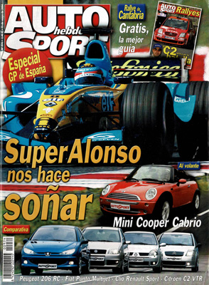 Al volante del Mini Cooper Cabrio y Citroën C3 Pluriel 1.4 HDi. Prueba Comparativa de los coches del Nacional de Asfalto: Citroën C2 1.6i 16V VTR/Fiat Punto 1.9 JTD/Peugeot 206 RC/Renault Clio Sport. Prueba del Nissan Pick-Up Rally Raid. G.P. de España de F1. Avance del Rallye de Chipre. Barcelona-Dakar 2005. Montaña: XIX Subida a La Santa y avance Subida al Fito.
