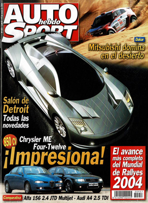 Salón de Detroit 2004. Prueba Comparativa: Alfa Romeo 156 2.4 JTD 175 Distinctive/Audi A4 2.5 TDi 163. Prueba del Opel Vectra Caravan V6 CDTi. Fórmula 1: Tests en Jerez y actualidad. El Dakar hasta la etapa 11ª. Entrevista a José Luis Echeverría, director del Circuito de Karting de Asturias.