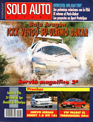 Baja Aragón '89. Entrevista a Jean Todt. Rallye San Agustín. Prueba del Volkswagen Passat CL Turbodiesel. G.P. de Gran Bretaña de F1. Prueba del Nissan Sunny GTi 16v. Entrevista a Andrés Vilariño. 24 Horas de Spa-Francorchamps. Campeonato del Mundo de Sport-Prototipos: Brands-Hatch. Subida Internacional al Fito.