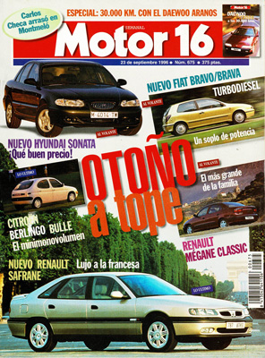 Prueba del Toyota Land Cruiser 3.0 TD. Al volante: Hyundai Sonata, Fiat Bravo/Brava Turbodiesel, novedades Citroën. Lo último: Nuevo Renault Safrane, Renault Mégane Classic y Ford Ka. 30.000 Kms. con el Daewoo Aranos. Rallye Príncipe de Asturias. G.P. de Catalunya de Motos.