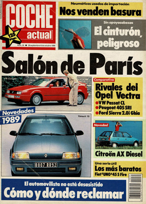 Novedades del Salón de París. Neumáticos usados de importación. Prueba del Fiat Uno 45 S Fire. El cinturón de seguridad. Nuevo BMW M5. Seat Ibiza "Miura". Prueba Comparativa: Ford Sierra 2.0i Ghia/Opel Vectra GL/Peugeot 405 SRi/Volkswagen Passat GL. El transporte escolar. Javier Díaz, el pilote de Fórmula más joven de Europa. Las locuras "Custom". Nuevo Citroën AX Diesel. Andorra, el paraíso del comercio. El coche de Hugo Sánchez.