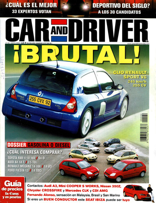 Prueba del Renault Clio V6. Contactos: Mini Cooper S, Hyundai Accent, Audi A3, Opel Meriva, Chrysler Crossfire, Nissan 350Z, Mercedes Sportcoupé 30 CDi AMG, Mercedes CLK Cabrio, Mitsubishi Outlander. Prueba Comparativa: Volvo XC70 Cross Country D5/Audi All Road Quattro 2.5 TDi. Gasolina o Diesel: Ford Fiesta 1.3 Ambiente 3p/Ford Fiesta 1.4 TDCi Ambiente 3p, Renault Mégane 1.6 Dynamique 3p/Renault Mégane 1.9 dCi Dynamique 3p, Audi A4 1.8T/Audi A4 2.5 TDi, Toyota RAV4 1.8 Luna 5p/Toyota RAV4 D4-D Luna 5p. Magazine: los 30 deportivos más emblemáticos de la Historia. Prueba Comparativa: Jaguar XKR 4.2 Coupé/Maserati Coupé F1. Por los castillos de Guadalajara con un Jeep Cherokee Renegade. Prueba de la Yamaha BT 1100 Bulldog. Consultorio. G.P. de Malasia de F1. G.P. de Brasil de F1. G.P. de San Marino de F1. Rallye de Nueva Zelanda.