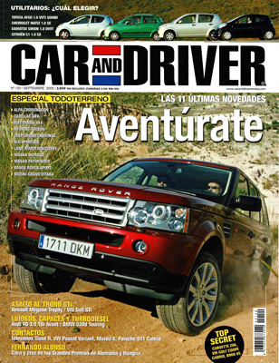 Prueba Comparativa: Renault Mégane Trophy/Volkswagen Golf GTi DSG. Contactos: Mercedes Clase R, Mazda 6, VW Passat Variant, Porsche 911 Carrera 4 Cabrio. Prueba Comparativa: Audi A6 3.0 TDI Avant Quattro/BMW 530d Touring. Prueba Comparativa: Chevrolet Matiz 1.0 SE/Citroën C1 1.0 SX/Daihatsu Sirion 1.0 DVVT/Toyota Aigo 1.0 WTi Sound. Prueba del Mitsubishi Carisma EVO VIII MR. Especial todo terreno: Fiat Panda 4x4 1.2/Alfa Romeo 156 Crosswagon 1.9 JTD Multijet/Kia Sportage 2.0 CRDI/Hyundai Tucson 2.0 CRDI/Nissan Murano 3.5/Cadillac SRX 3.6/Suzuki Gran Vitara XL-7 HDI/Nissan Pathfinder 2.5 DCI/Jeep Grand Cherokee 3.0 CRD/Land Rover Discovery TDV6/Range Rover Sport Supercharged. Los coches de Marc Gené: Maserati Grand Sport y Alfa Romeo GT 3.2 V6. BMW K1200 Roadster. Consultorio. G.P. de Hungría de F1. G.P. de Alemania de F1. Rallye de Argentina. Historia: Circuitos urbanos en España.