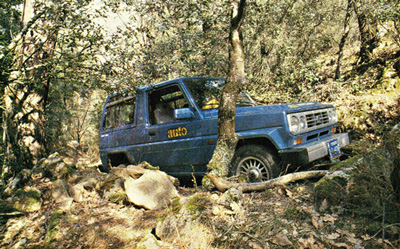 Las pendientes que podemos atacar con este TT son de gran desnivel y nunca se achica por grande que sean. He de insistir que los neumáticos no son los más adecuados, por no decir que son nulos. Esas atractivas llantas con unos buenos calzados para montaña, seguramente que los frecuentes patinajes que nos hacía en terrenos húmedos o blandos no nos lo hubieran hecho. Sus ángulos de ataque y de salida ni que decir tiene que son prácticamente los mismos que en el Daihatsu, por lo tanto huelga a ese comentario, aunque diremos que son buenos. Tan solo hemos notado que su altura respecto al suelo y zonas donde haya tumultos o grandes baches, la panza, o sea los bajos, pueden tocar un poco, sobre todo la zona del protector del tubo de escape.