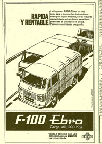 El vehículo F-100 Ebro, fabricado por F. A. D. I. S. A. en diez versiones de origen, constituye una de la gama más amplia, racional y moderna del transporte ligero en España. La experiencia de la gran marca italiana Alfa Romeo en el sector de vehículos de transporte se ve reflejada en las numerosas cualidades que posee este vehículo.