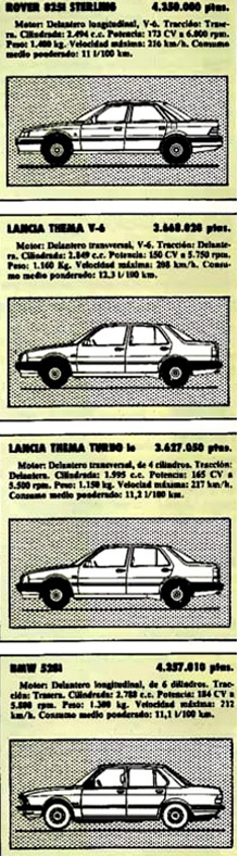 Tomando el precio, los coches a contemplar son el Lancia Thema V-6 -que no se importa regularmente en España, pero que se puede pedir- y el Turbo ie, y el BMW 528 i. De estos tres coches, los más baratos son los dos Thema, de los cuales resulta algo más interesante el Turbo, que rinde más y consume menos. Son menos anchos que el Rover, pero tienen una semejante habitabilidad y un maletero más grande. El BMW es el que tiene el motor más potente -también es el que lleva el motor más grande-, pero, en cambio, tiene la menor habitabilidad interior para un precio semejante al del Rover, que está en el justo medio entre los coches italianos y el alemán.