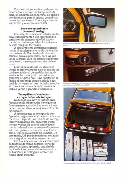 Yo tengo poca experiencia con la marca y con este coche. Ni dos meses. Se trata de un W123 200D matriculado el 1-1-79. Le he notado un nivel muy bueno de estabilidad. Dado su gran peso y su, que le vamos a hacer, poco nervio. Su poco caballaje hace que el conductor este bien atento a entrar en las cuestas. Si vas a mas de 80 Km/hora el adelantar a otro coche en una carrtera de doble circulacion no es una opcion.