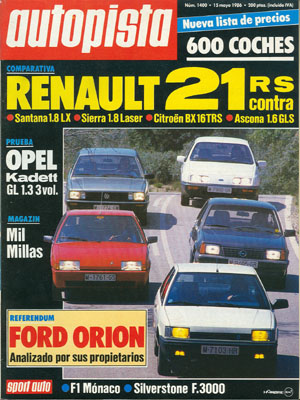 Comparativa: Renault 21 RS frente a Citroën BX 16 TRS/Ford Sierra 1.8 Laser/Opel Ascona 1.6 GLS/Volkswagen Santana 1.8 LX. Mil Millas Históricas, con la participación del Pegaso Z-102 Spider Touring Tibidabo. Referendum al Ford Orion. Lancia Aurelia. Banco de Pruebas del Opel Kadett 1.3 GL 3 vol. Gran Premio de Mónaco de F1. 1.000 Km de Silverstone.