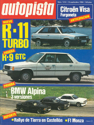 Primer contacto con el Opel Kadett. Primer contacto con el Renault 11 Turbo. Banco de Pruebas del Renault 9 GTC. Comparativa: BMW Alpina B6/B7 Turbo/B7 Turbo Coupé. Prueba de la Autocaravana Niesmann Clou-L. 1.000 km de Spa-Francorchamps. Rallye RACE-Castellón. Gran Premio de Italia de Fórmula 1.