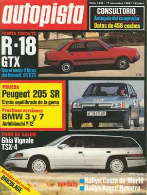 Primer contacto con el Renault 18 GTX. Banco de Pruebas del Peugeot 205 SR. Prueba del Bitter SC 3.9. Trofeo Marlboro en el Jarama. Rallye Costa de Marfil. Rallye Vasco-Navarro.